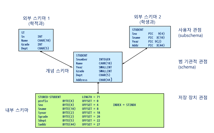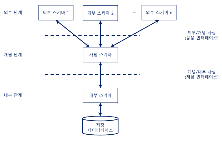 - 개념/내부 사상 : 개념 스키마와 내부 스키마간의 대응 관계를 정의 (저장 인터페이스) - 물리적 데이터 독립성 제공