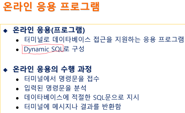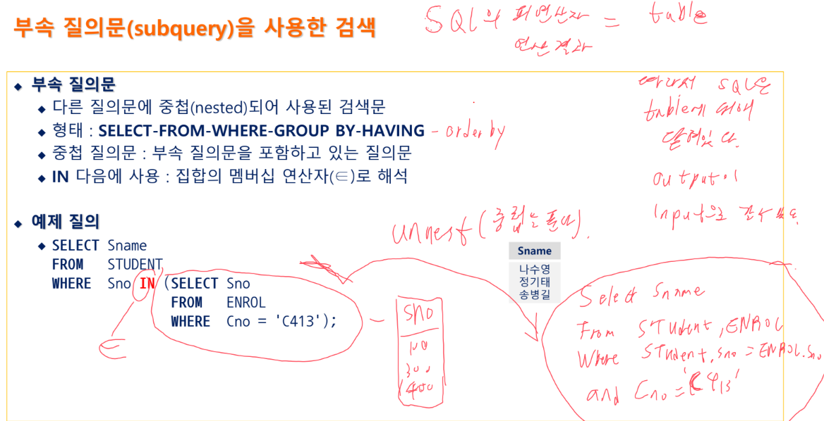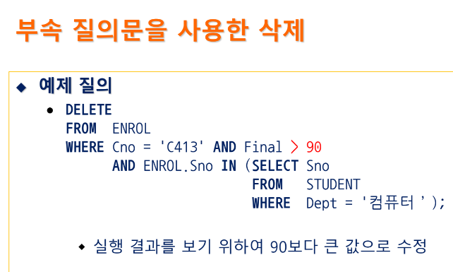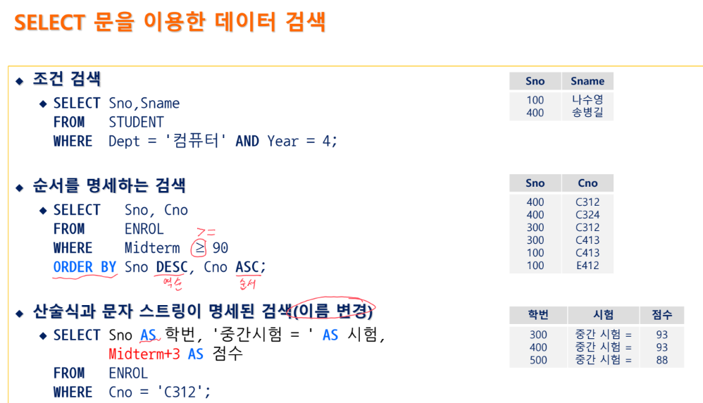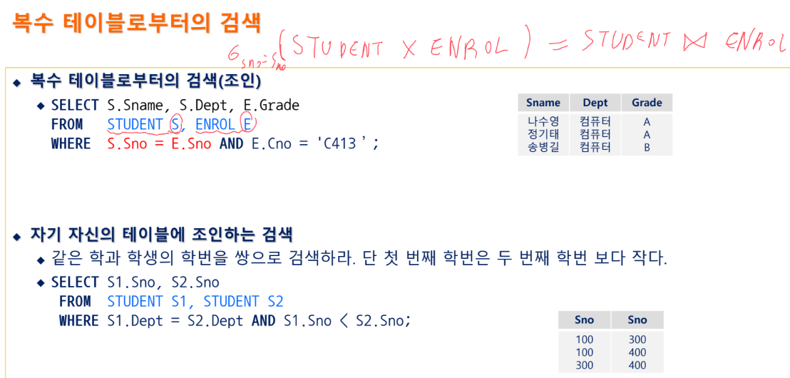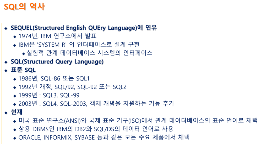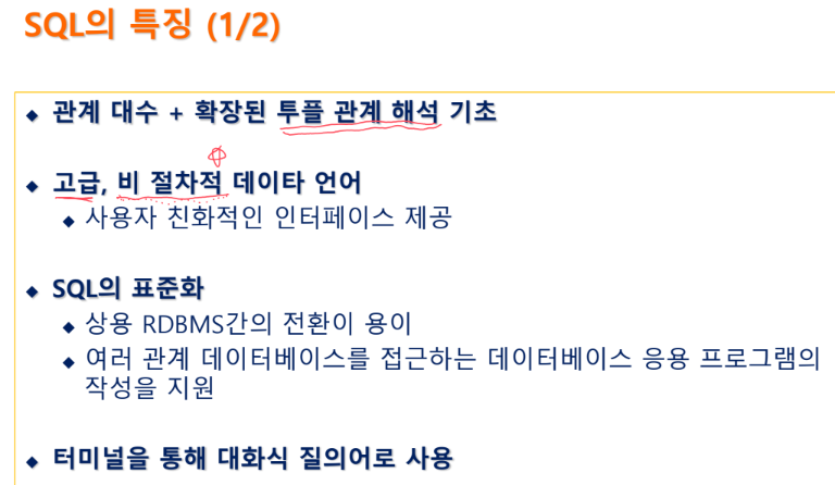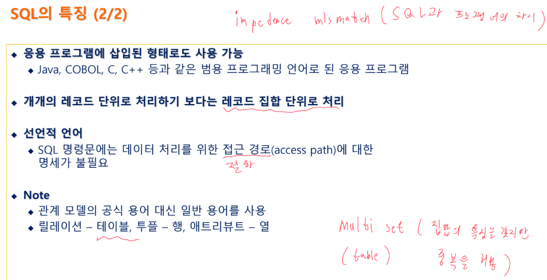 - 종합 데이베이스 언어 역할 : 단순히 검색만을 위한 질의어가 아님 (유저 생성 / 질의 ...)