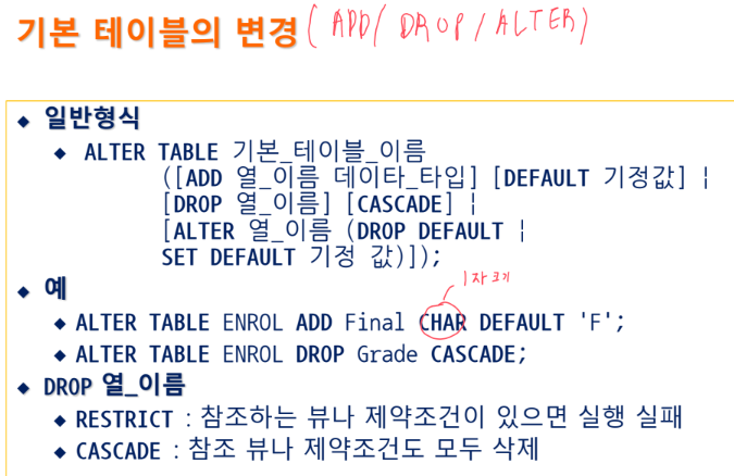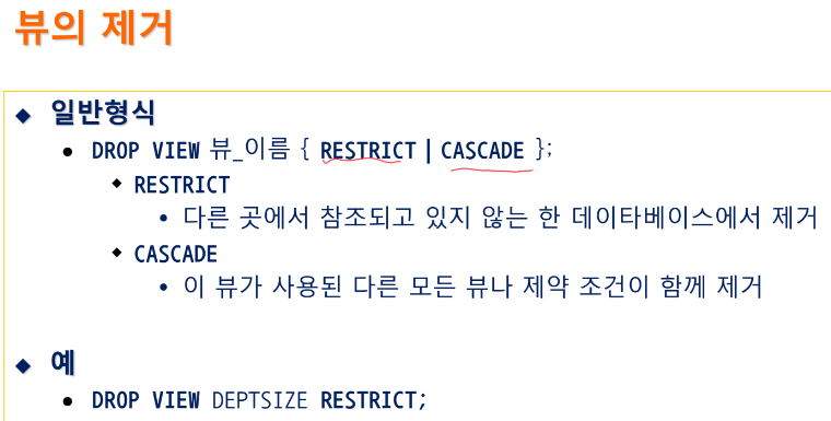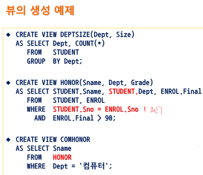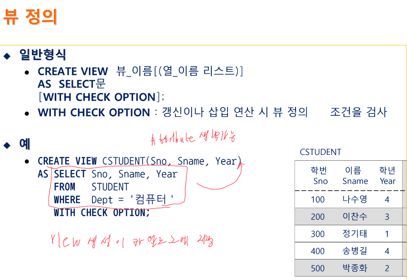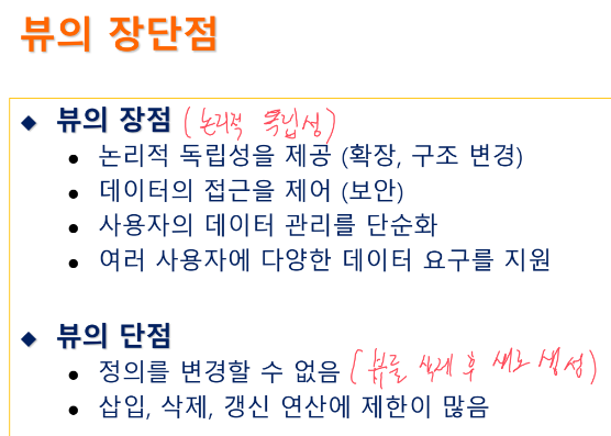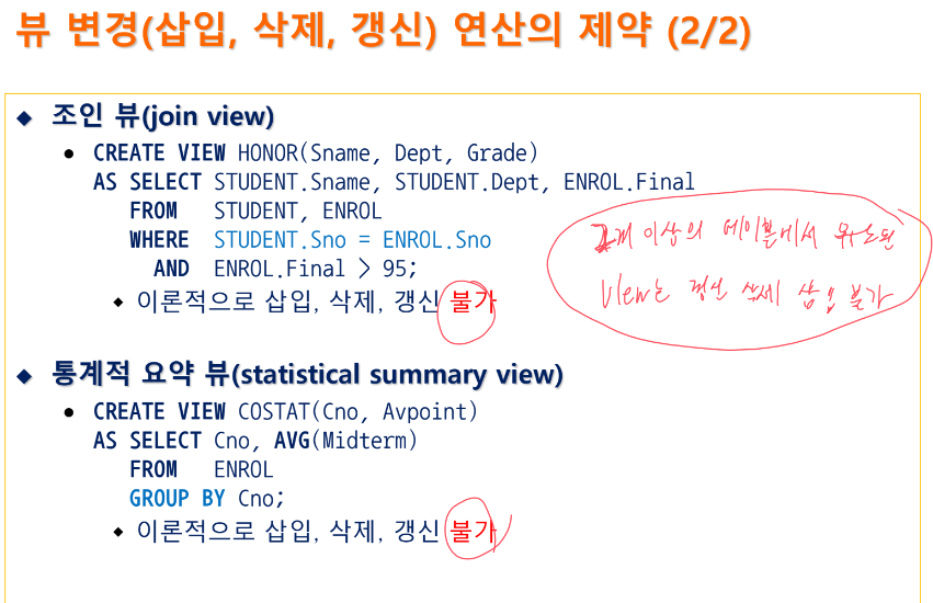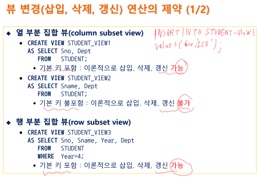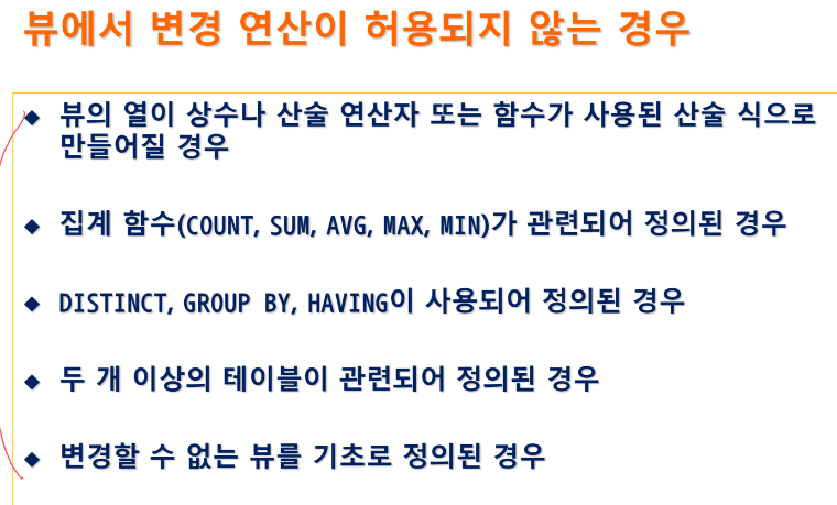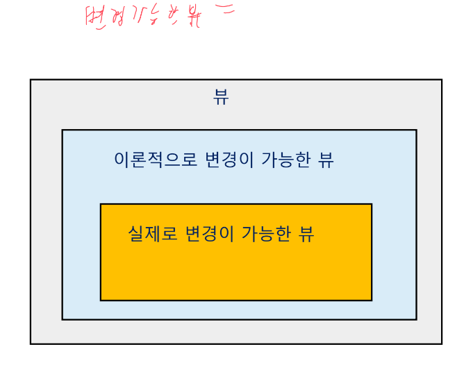 변경 가능한 뷰 : 어느 한 기본 테이블의 행과 열의 부분집합으로만 정의되어야 한다.
