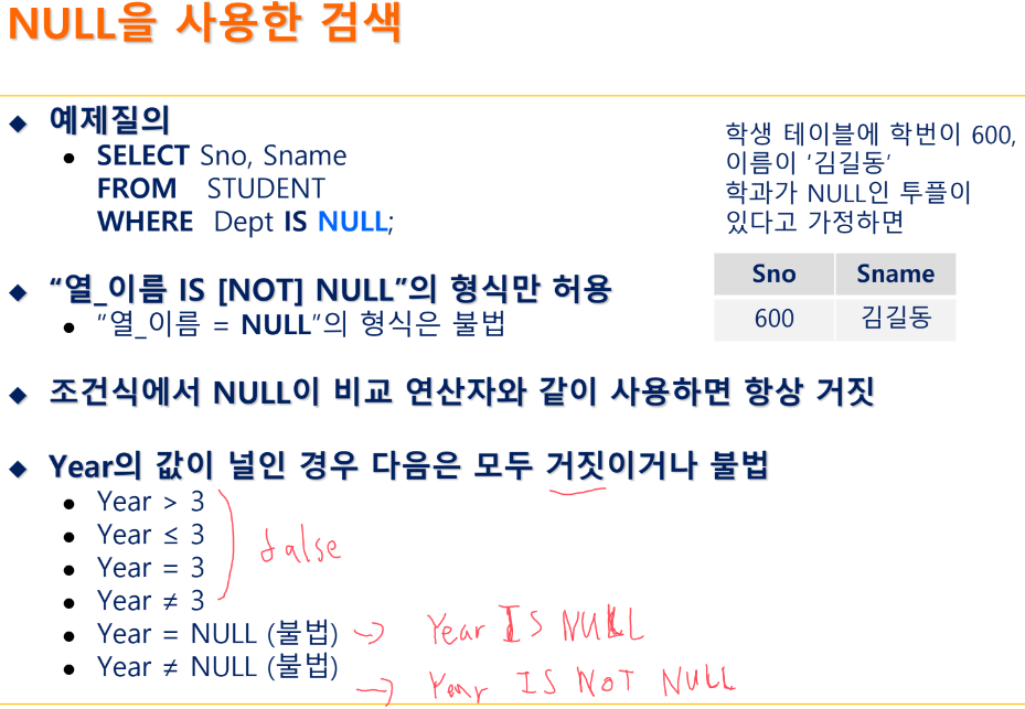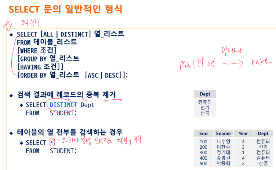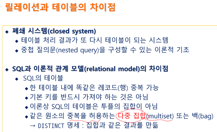 - SQL의 테이블이 투플의 집합이 아닌이유 : 집합은 두개의 똑같은 원소를 허용하지 x / 따라서 중복을 허용하는 다중집합이나 백이다.