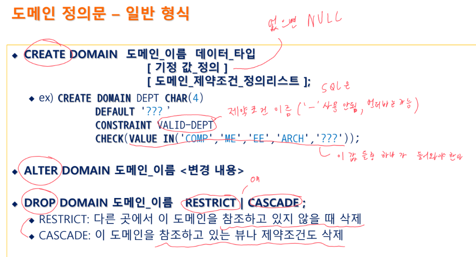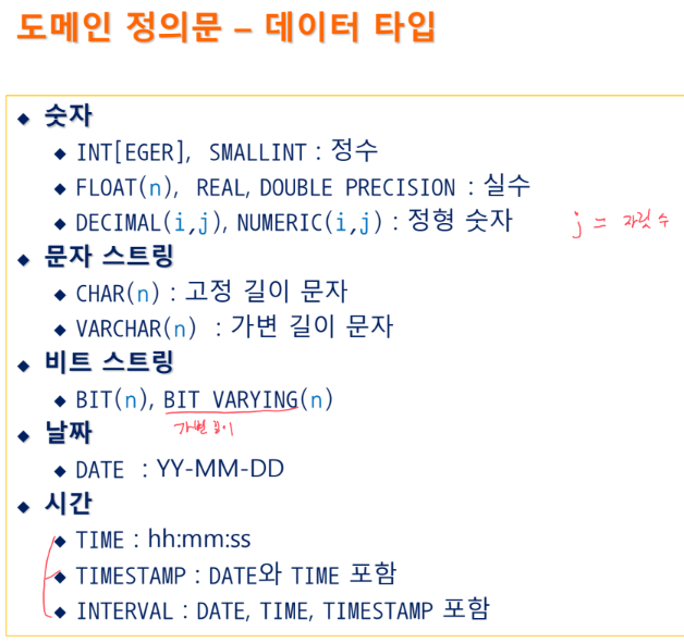 SQL에서의 도메인은 SQL이 지원하는 데이터 타입으로만 정의할 수 있다.
