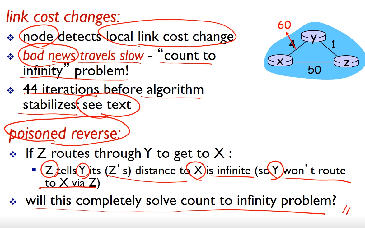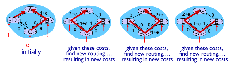 - 링크 상태 (LS): n개의 노드와 E개의 링크가 있을 때, O(nE) 메시지가 전송됨