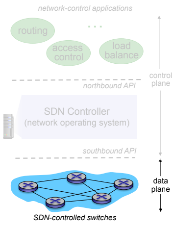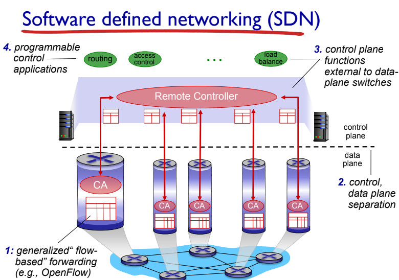 2. **테이블 기반 포워딩 (OpenFlow API):** 라우터를 "프로그래밍"하여 미리 정의된 규칙을 기반으로 전달 결정을 내릴 수 있습니다.