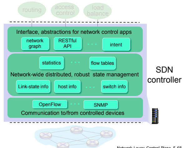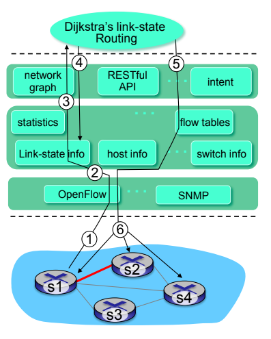 2. 네트워크 전체 상태 관리 계층: 네트워크의 상태를 관리하며, 링크, 스위치, 서비스의 상태를 포함하는 분산 데이터베이스