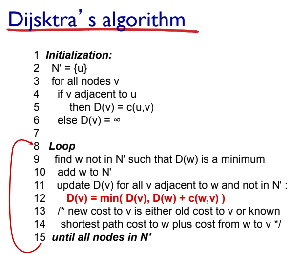 c(x,y): 노드 x에서 y로의 링크 비용; 직접 이웃이 아니면 ∞