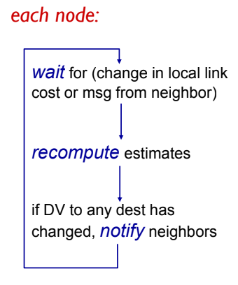 - 이웃들의 거리 벡터를 유지함. 각 이웃 v에 대해 x는 Dv = [Dv(y): y ∈ N]를 유지함