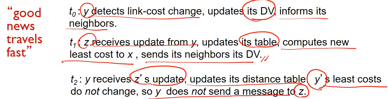 - 각 노드는 자신의 거리 벡터가 변경될 때만 이웃에게 알림 : 이웃은 필요한 경우 자신의 이웃들에게 알림