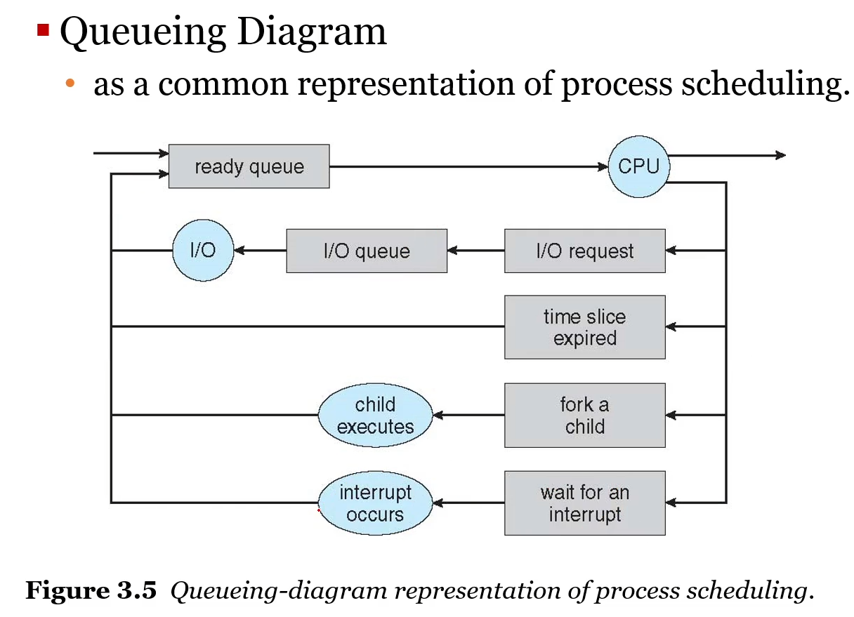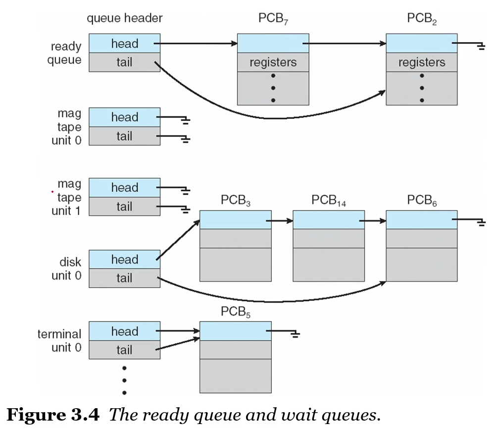 - 프로세스들이 시스템에 들어갈때, 그들은 Ready queue(CPU의 코어에서 실행되기 전에 Waiting과 Ready하는 곳)에 들어간다.