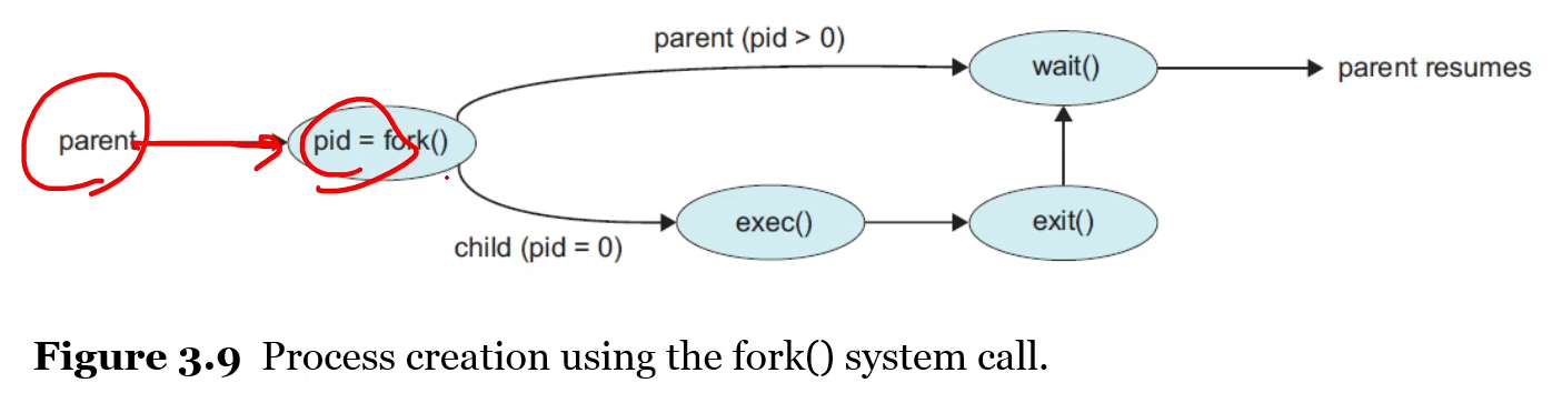 fork() 시스템 콜 이후에 부모는 계속해서 실행되거나, 자녀들이 실행될때 아무것도 할게 없다면, 자녀의 종료까지 ready queue 에서 자기자신을 빼두기 위해 wait()시스템 콜을 발생시킬 수 있다. (wait queue 로 이동해 자녀 프로세스의 interuppt를 기다린다는 것)