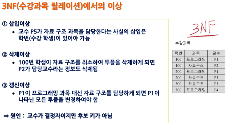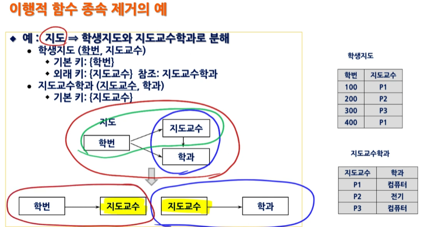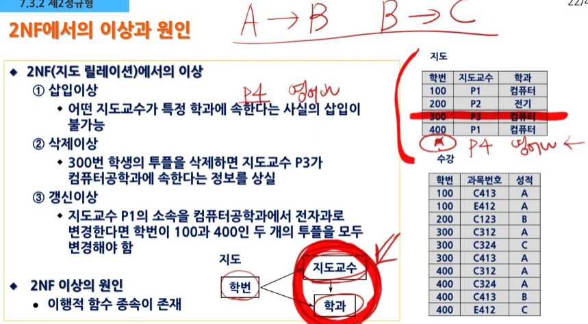 2NF이상의 원인 : 이행적 함수종속 : A=>B, B=>C (학번 => 지도교수, 지도교수 => 학과)