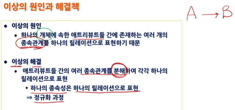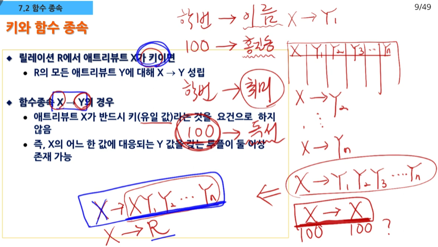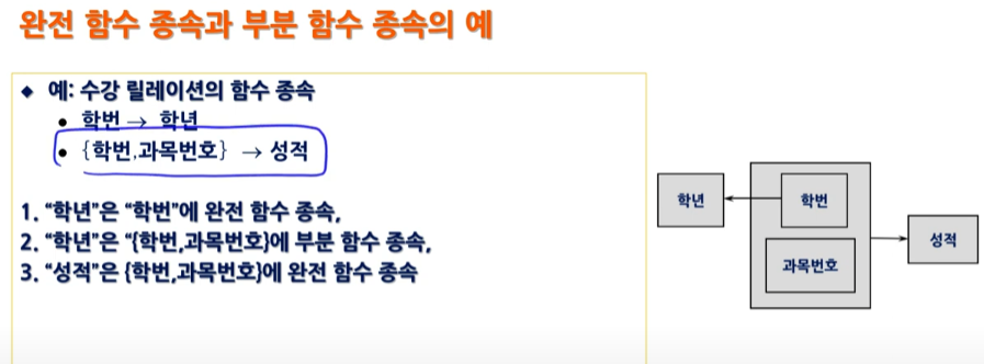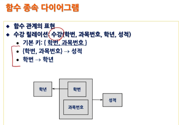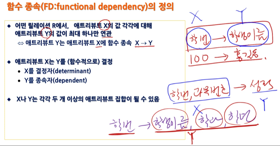 -- 애트리뷰트들간의 관계성(relationship): 데이터 종속성 (A -> B : A와 B는 서로 종속적 관계가 있다 | 학번 -> 학생이름)