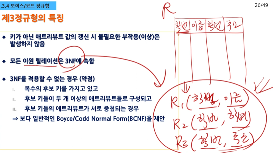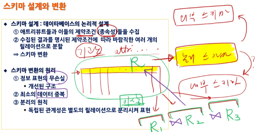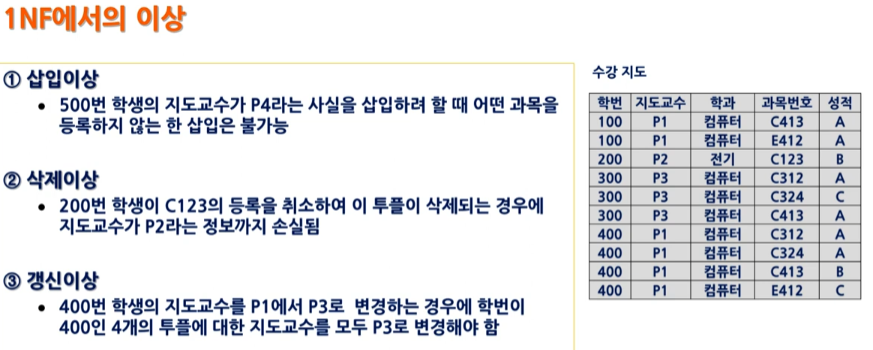 - 모든 함수 종속을 하나의 스키마로 만들면 변환 과정에 이상 발생