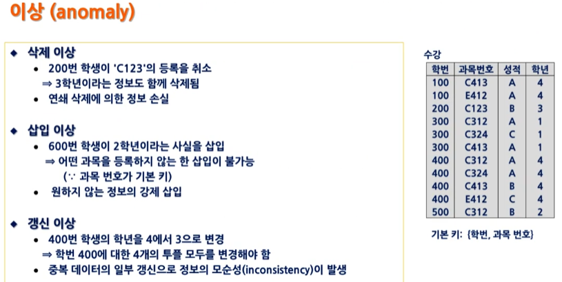 - 데이터 변경 시의 이상현상 (삽입, 삭제, 변경)