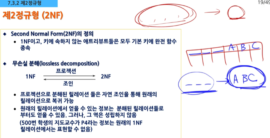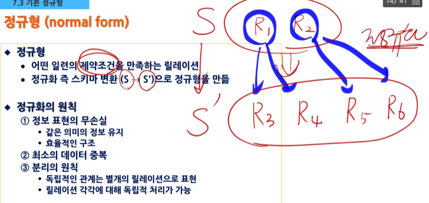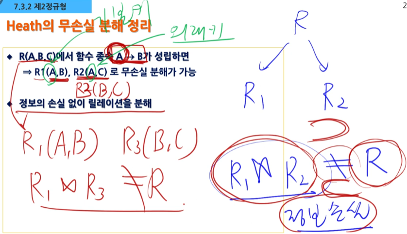 1. 정보 표현의 무손실 : 하위 릴레이션들을 조인하면 R릴레이션이 나와야 한다.