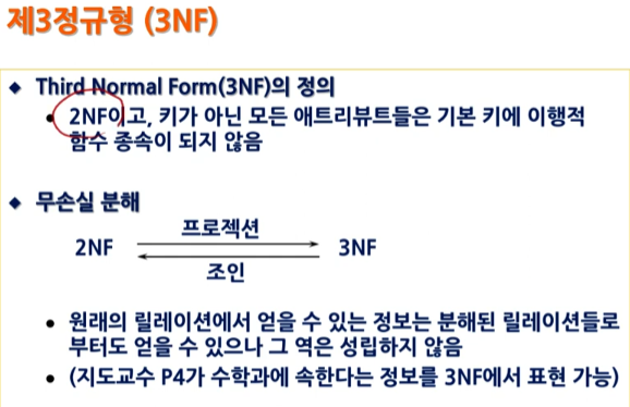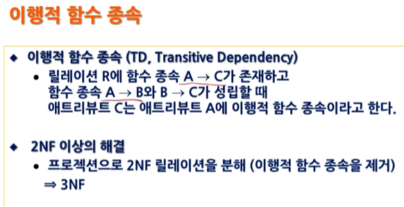 (3) 3NF : 프로젝션으로 2NF 릴레이션을 분해(이행적 함수 종속을 제거)