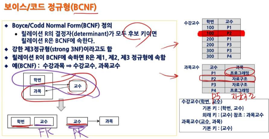 (4) BCNF (strong 3NF) : 릴레이션의 모든 결정자가 후보키인 경우