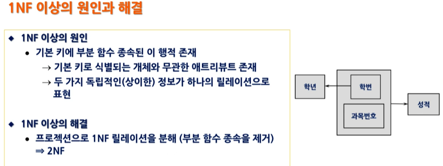 수강 : 1NF에서 학번, 과목번호, 성적으로 프로젝션