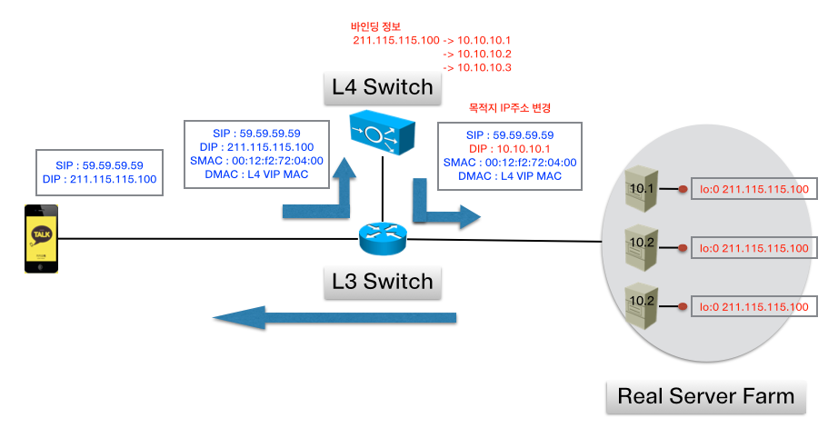 - L4 Load Balancer : OSI 7계층 중 4계층인 Transport 기반의 로드벨런서로 TCP,UDP,HTTP와 같은 프로토콜들의 헤더를 분석하여 그 정보를 바탕으로 부하 분산을 실시하고 Source/Destination IP 를 NAT(Network Address Translation) 하여 보낼 수 있다.