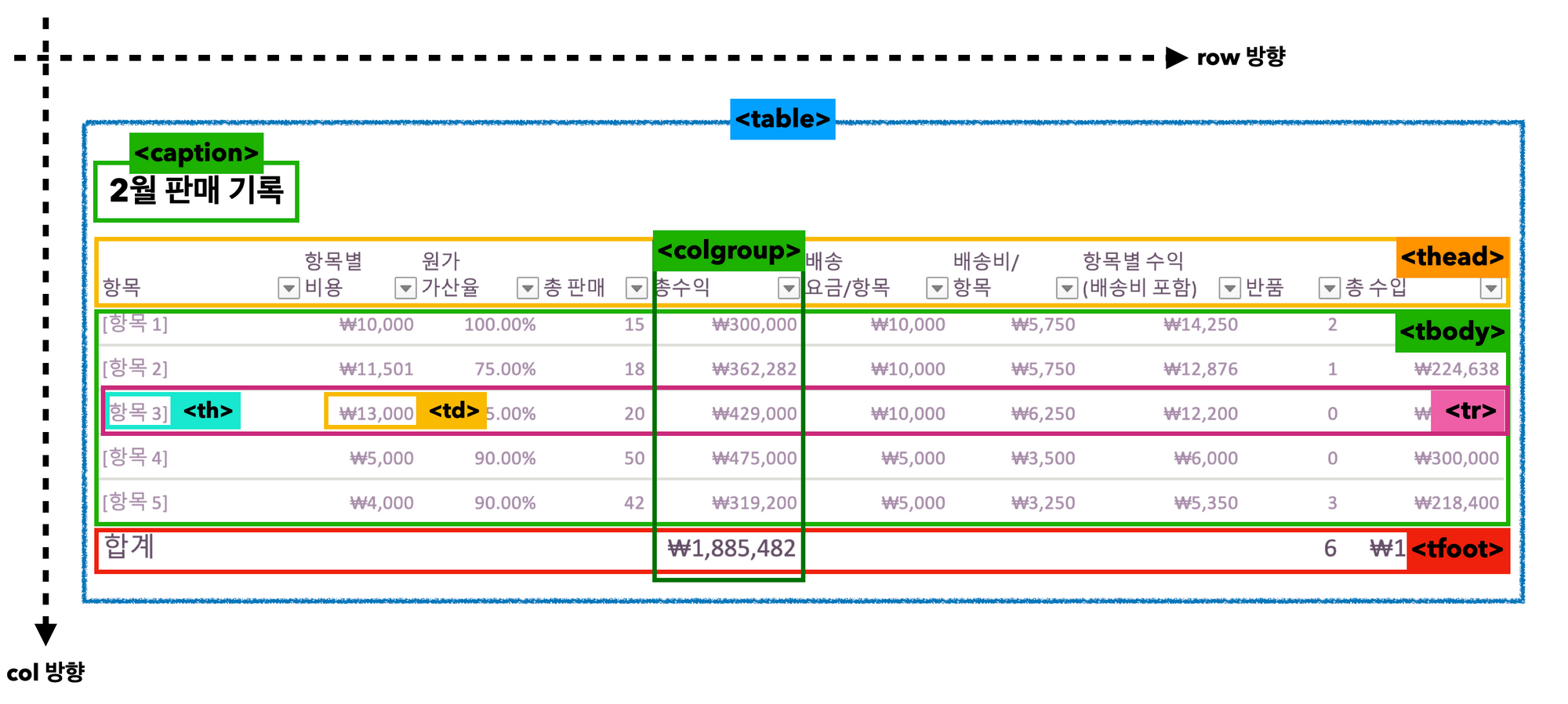 - 테이블의 머리글, 본문, 바닥글을 의미
