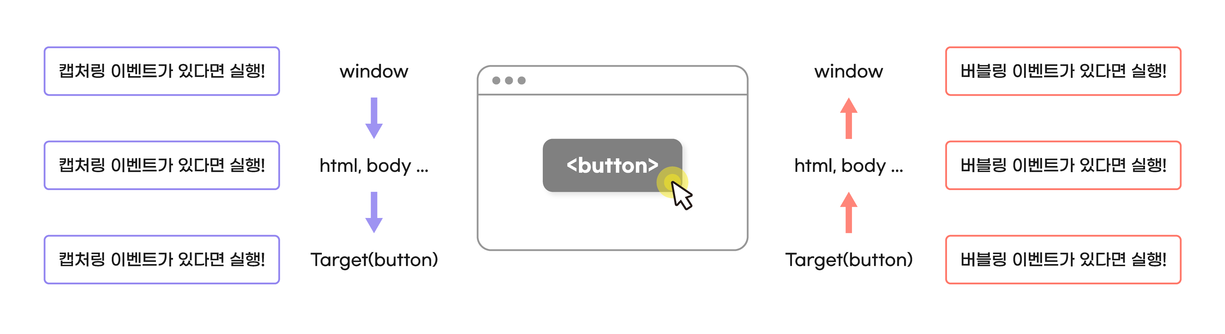 - 버블링 단계 : 이벤트 대상을 찾고 캡처링이 끝난후, 다시 DOM 트리를 따라 올라가며 만나는 모든 버블링 이벤트 리스너를 실행