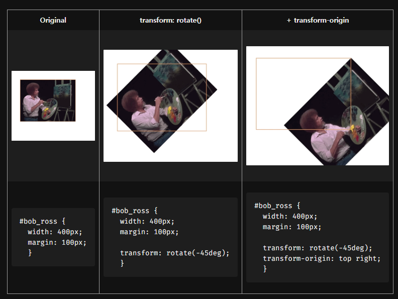 #bob_ross{ width: 400px; transform: rotate(45deg); }