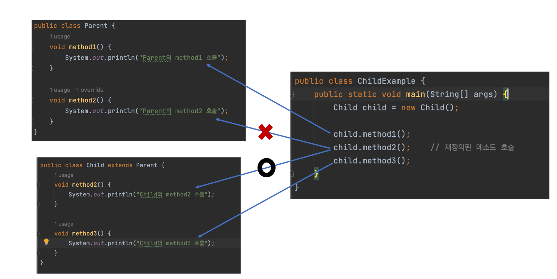 - 메소드가 오버라이드되면 부모 객체의 메소드는 숨겨지므로 자식 메소드가 호출된다.