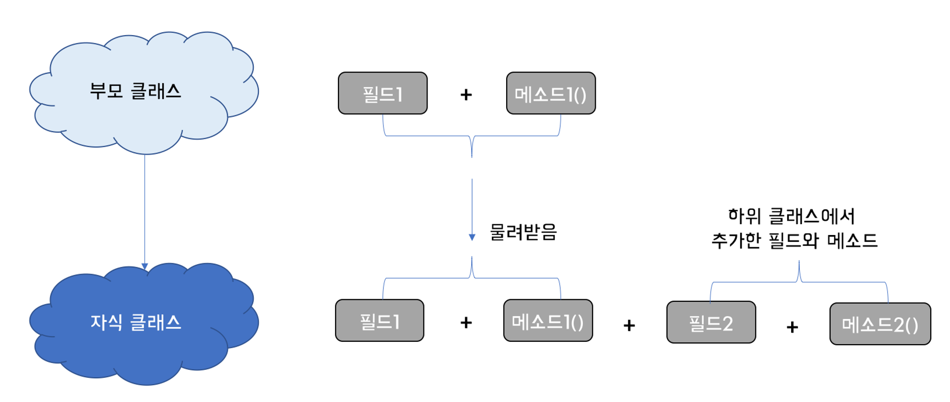 class 자식클래스 extends 부모클래스 // 부모클래스 하나만 상속 가능{ // 필드 // 생성자 // 메소드 }