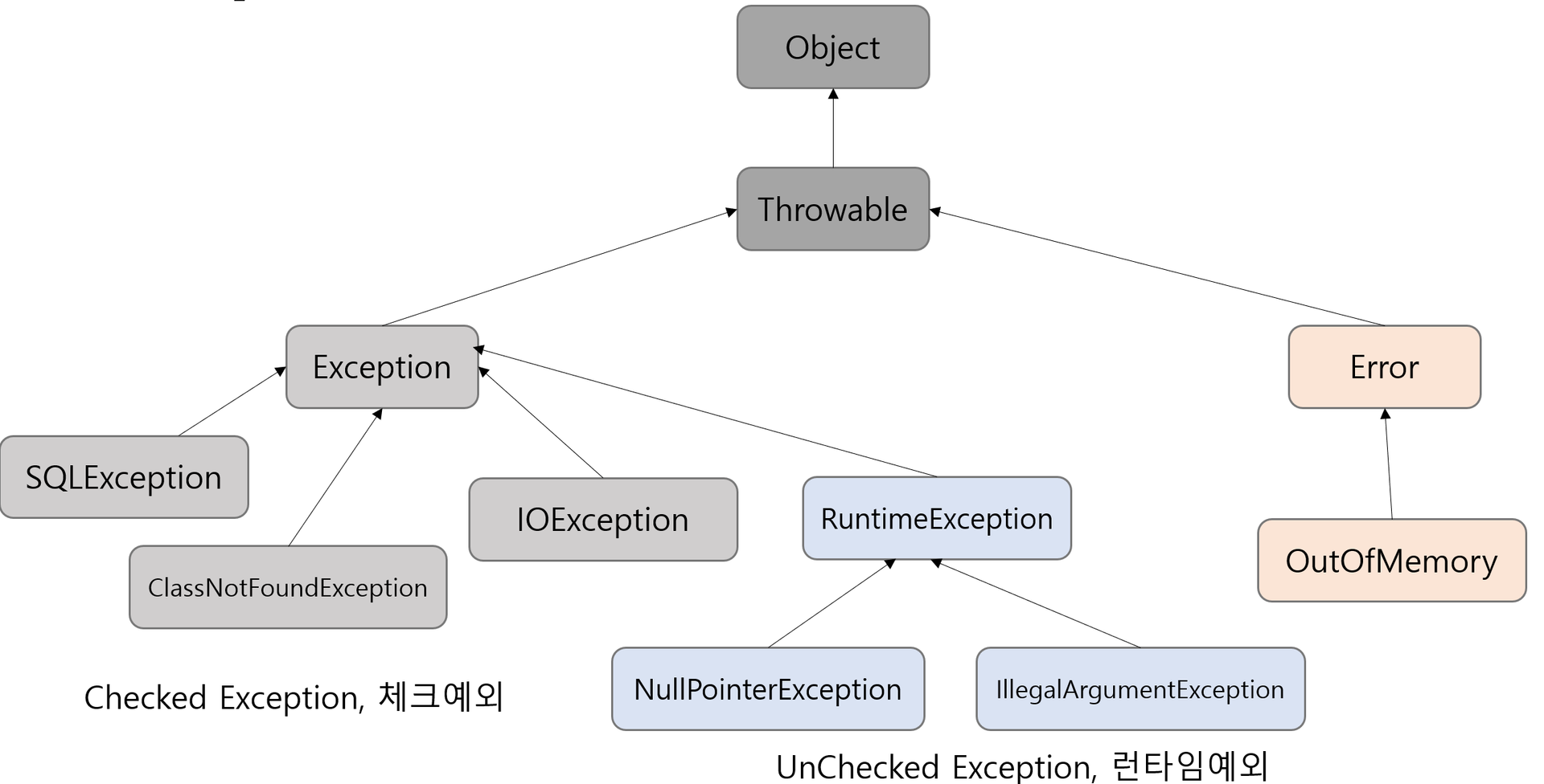 - Exception : 컴파일러가 체크하는 checked exception. 단 RuntimeException은 예외