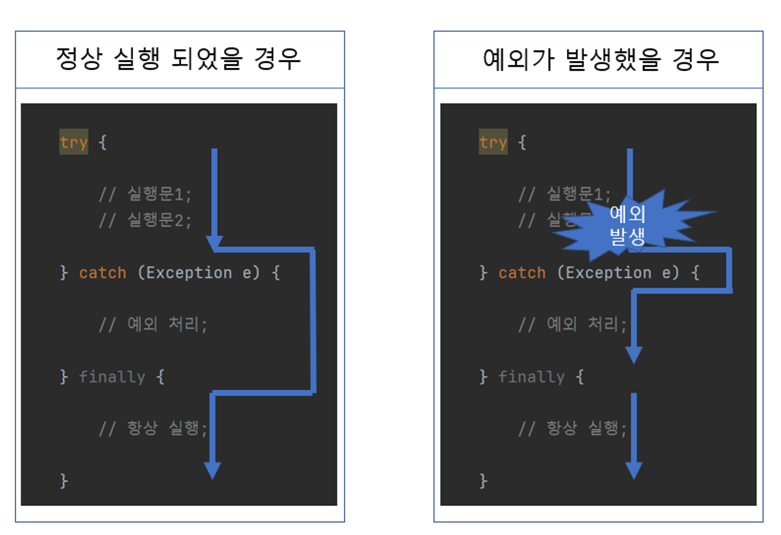 try { <수행할 문장 1>; <수행할 문장 2>; ... } catch(예외1) { <수행할 문장 A>; ... } catch(예외2) { <수행할 문장 a>; ... } ----------------------------------------------------------------------------------- try { <수행할 문장 1>; <수행할 문장 2>; ... } catch (예외1 | 예외2) { // 둘 중 하나가 예외일 경우 A 수행 (멀티 catch) <수행할 문장 A>; ... }- 수행할 문장 1에서 에러가 발생한다면, 해당 오류에 맞는 catch 로 이동해 실행하고, 끝나면 try를 빠져나간다.